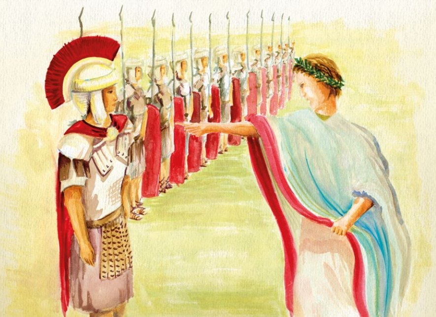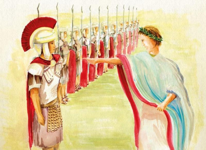 V té době bylo dobrým zvykem, že před bitvou rozdával vojákům žold sám císař. Zavolal si tedy i mě, aby mi předal dar. Jenomže netušil, co se mu chystám říci. Když na mě přišla řada, přistoupil jsem k němu a řekl mu: „Až dosud jsem bojoval za tebe. Teď dovol, abych bojoval za Boha.“ Neumíte si představit to ticho a napětí. Císař zrudl a začal na mě křičet: „Vzpíráš se vojenské službě ne kvůli víře, ale kvůli strachu ze zítřejší bitvy!“ Celý se vzteky třásl a dál křičel: „Ty, syn veterána a důstojník mé gardy, ty se bojíš bitvy? To je zrada na císaři!“ Počkal jsem chvilku, až se uklidní, a pak jsem mu klidným hlasem řekl: „Zítra půjdu před šik vojáků, beze zbraně. Chránit mě bude jen znamení kříže.“