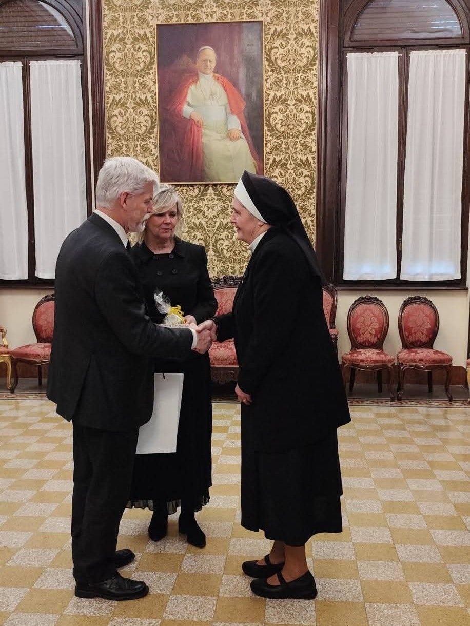 Český prezident Petr Pavel během své návštěvy papeže Lva XIV. ve Vatikánu (19.1.2026) navštívil se svou chotí i Papežskou kolej Nepomucenum, kde se setkal s rektorem Tomášem Koumalem, českými bohoslovci a sestrami boromejkami. Sestra Vojtěcha při té příležitosti pohovořila s první dámou Evou Pavlovou a věnovala ji svoji poslední kuchařskou knihu Dobroty sestry Vojtěchy, kterou vydala v našem nakladatelství v závěru loňského roku. (©japo)